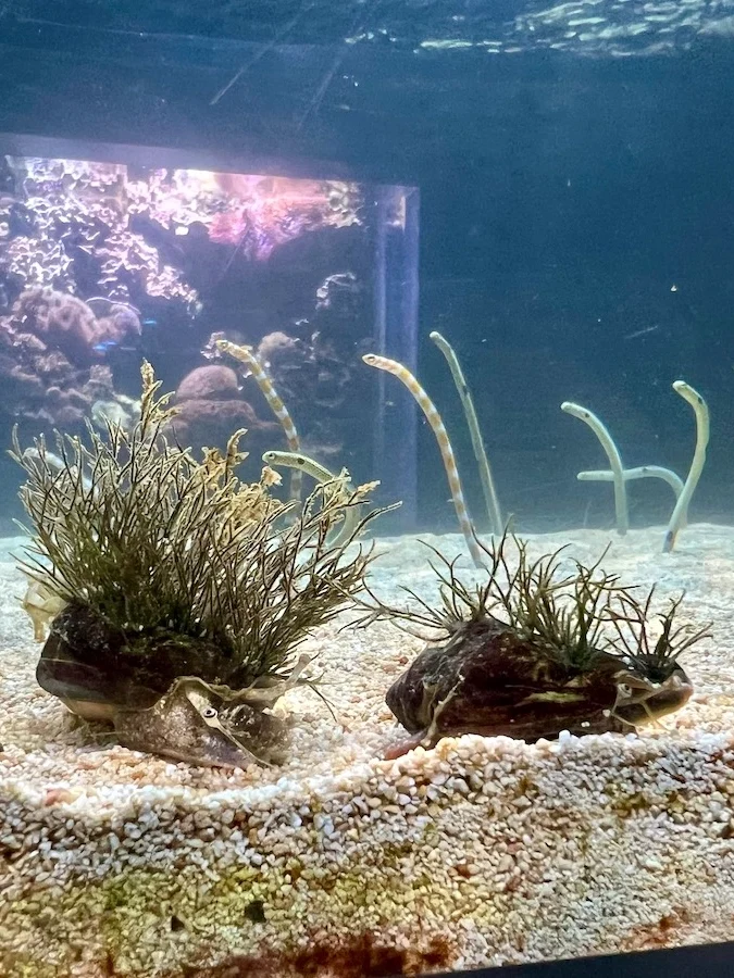 位在一樓的小型水族箱區,可以看到大家比較熟悉的小丑魚、海馬等熱帶魚,還有沖繩很有人氣的花園鰻,以及各種顏色的珊瑚。
