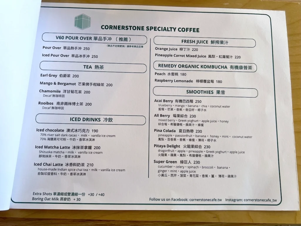 Cornerstone Cafe 的菜單以澳式早午餐為主,另外也有燉飯、塔可餅、和牛起司堡等特色料理。餐點價格大約落在 NT$380-580,只能說民生社區的餐廳本來就不算便宜。